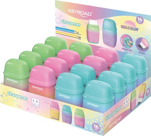 Combinación de goma y sacapuntas de plástico de 2 usos para puntas de 8 mm y 11 mm. Con depósito y tapa. Cuchilla de alta calidad. Colores pastel. Expositor de 16 unidades.