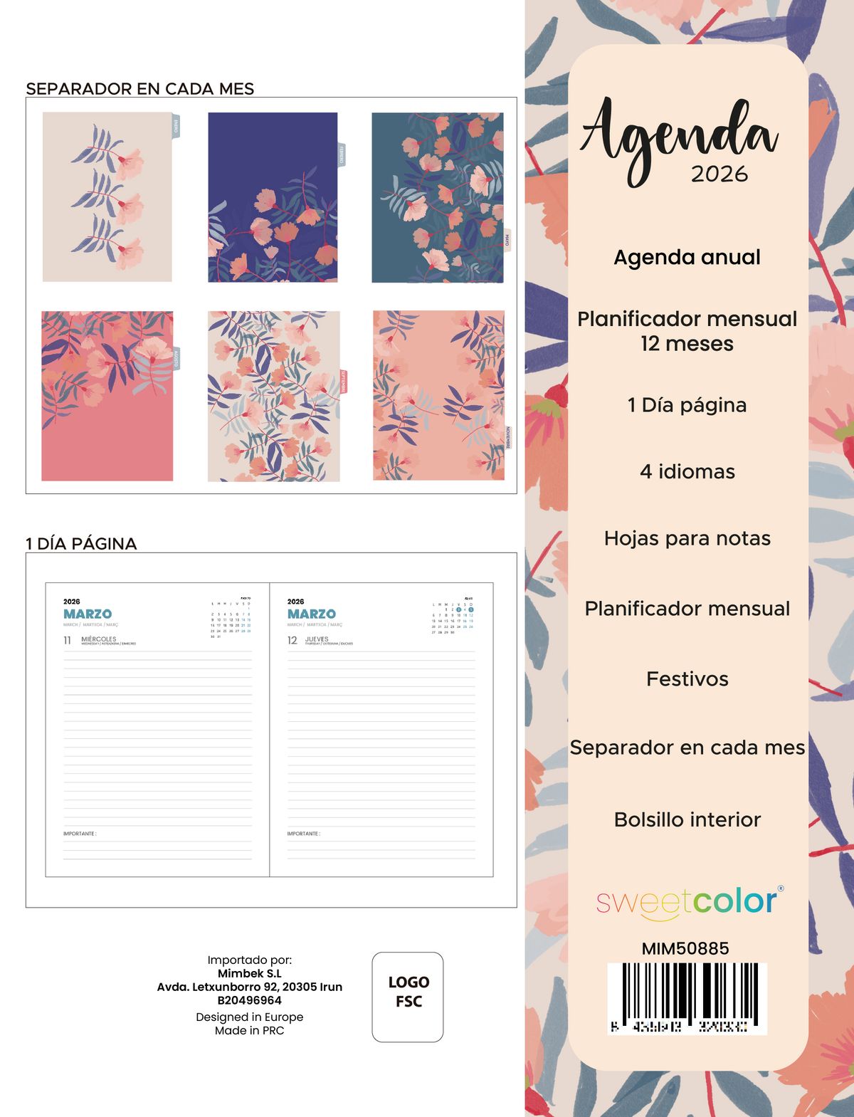 Agenda anual 2026. 12 meses; de enero a diciembre.•Día página.•Hojas para notas.•Planificadores mensuales.•Calendario Anual 2026/2027.•Fechas importantes.•Webs de interés.•Contactos importantes.•Planificador anual.•Horarios.•Planes del mes.•Separadores mensuales originales.•Apartado de notas y recordatorios.• Bolsillo interior.• 4 Idiomas: Castellano, Inglés, Euskera y Catalán.•Hojas de 80 gr. Certificado FSC.•Goma de cierre. Encuadernación en espiral plástico.•Portadas forradas, encuadernadas con esquineras metálicas de refuerzo. •Dimensiones: 17,5 x 21,5 cm.