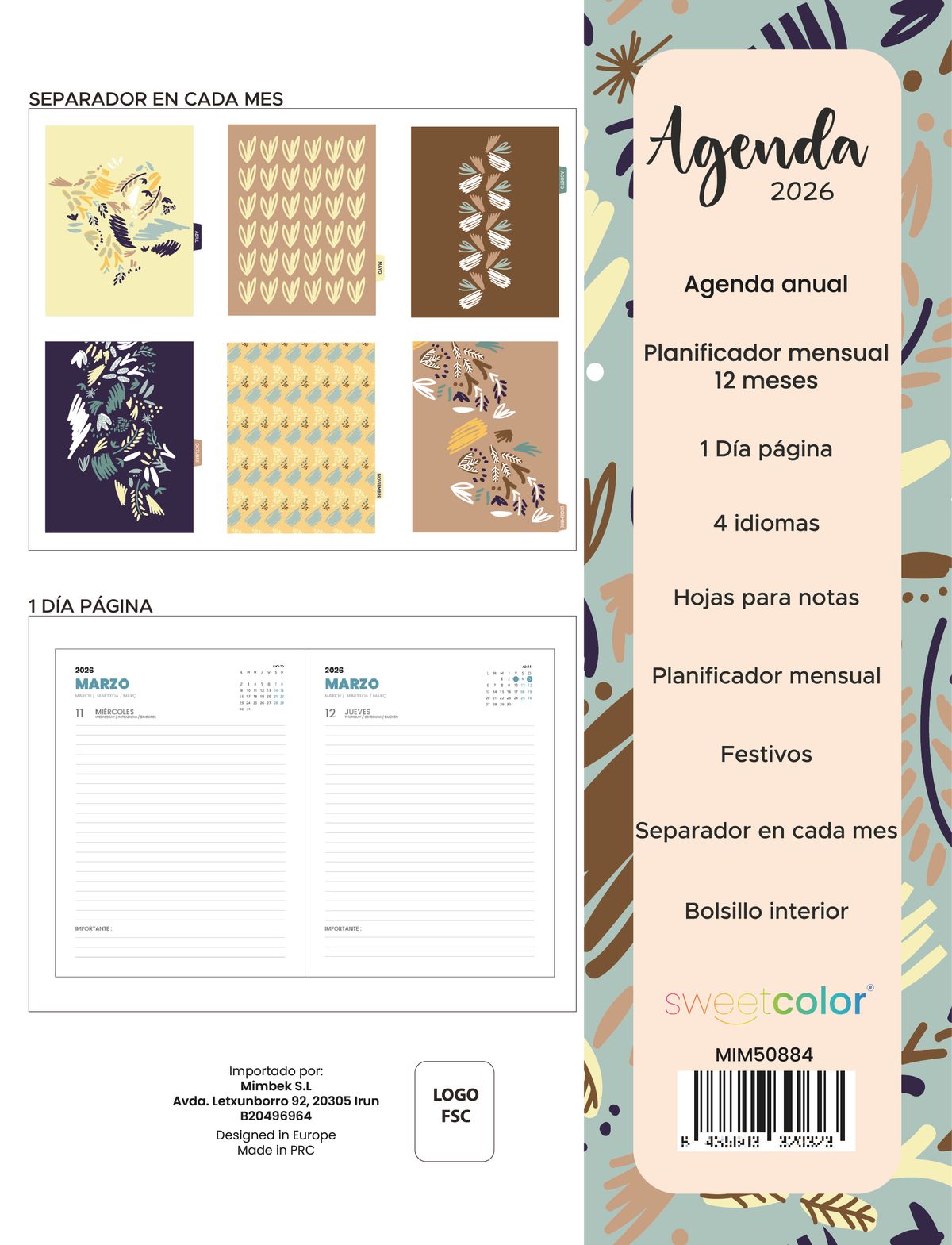 Agenda anual 2026. 12 meses; de enero a diciembre.•Día página.•Hojas para notas.•Planificadores mensuales.•Calendario Anual 2026/2027.•Fechas importantes.•Webs de interés.•Contactos importantes.•Planificador anual.•Horarios.•Planes del mes.•Separadores mensuales originales.•Apartado de notas y recordatorios.• Bolsillo interior.• 4 Idiomas: Castellano, Inglés, Euskera y Catalán.•Hojas de 80 gr. Certificado FSC.•Goma de cierre. Encuadernación en espiral plástico.•Portadas forradas, encuadernadas con esquineras metálicas de refuerzo. •Dimensiones: 17,5 x 21,5 cm.