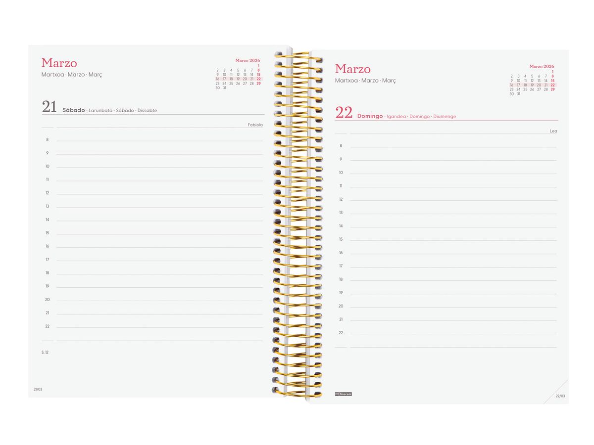 Agenda de espiral con tapas ligeras de polipropileno. Diseño en tendencia y a la moda. Ideal para uso personal y/o profesional. Con goma elástica. Con esquinas microperforadas para localizar rápidamente el día/semana en curso. El diseño interior es limpio y fácil, con espacio suficiente para organizar tus proyectos, tareas y compromisos. Agenda con información de interés en la anualidad y otros contenidos extra orientados a la organización personal. Formato similar a DIN A5; con las ventajas de una agenda portable y una de sobremesa. Duración: Enero 2026 - Diciembre 2026 (12 meses). Interior: 1 Día Página. Amplio espacio de escritura para cada día. Con horas. Sábados y domingos en página completa. Con información de los festivos de España. La anualidad de la agenda incluye la información relativa a: onomástica, festivos nacionales, cambios de estación e inicios de los años nuevos chino, musulmán, ortodoxo y hebreo. La agenda dispone también de otros contenidos extra: datos personales, calendarios, horarios, objetivos del año, plan anual, fechas importantes, otras fechas, hojas para checklist, hojas para notas, hoja para ocio y hojas para teléfonos, direcciones y e-mails. Artículo en español con anualidad multilingüe: español, euskera, gallego y catalán. Formato: E10 - 155x212 mm. Tapas de polipropileno, espiral simple metálica y papel. 70 g/m². Papel FSC®.