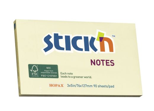 Bloc de 90 notes autocollantes jaune pastel. Avec certificat FSC. Produit biologique