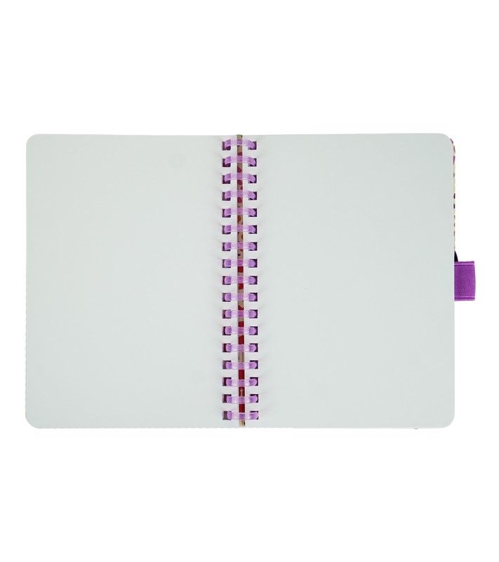 Cahier à spirale en plastique au format A6. 80 feuilles lisses de 90gr. Fermeture avec caoutchouc. Poche intérieure et porte-stylo.