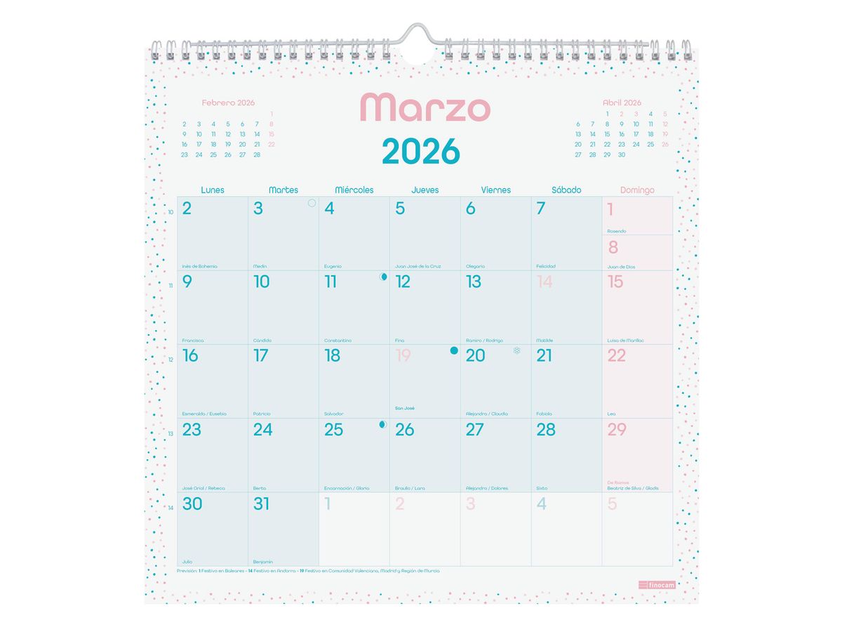 Calendario Chic anual de pared encuadernado con espiral doble y con colgador. Con un toque desenfadado para dar un aire fresco a tu organización. Contiene información útil y de interés, espacio diario para anotaciones y con mes anterior y posterior en cada página. Perfecto para planificar tus días. Ideal para la oficina o el hogar. Duración: Enero 2026 - Diciembre 2026 (12 meses). Interior: Mes Vista. Para planificarse a nivel mensual. Con información de los festivos de España. La anualidad del calendario incluye la información relativa a: festivos internacionales, fases lunares y cambios de estación. El calendario dispone de contenidos extra: calendarios reducidos de septiembre a diciembre del año anterior, planning anual, plantilla de horario, calendario anual del año y del año siguiente, listado de festivos internacionales y códigos de países. Idioma del artículo: español. Formato: 30X30 - 300x300 mm. Papel y espiral doble metálica. 120 g/m². Papel FSC®.