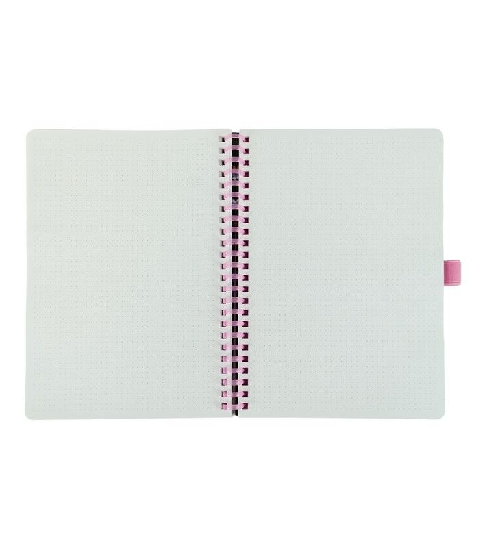 Cahier à spirale en plastique au format A5. 80 feuilles de papier ligné pointillé 90gr. Fermeture avec caoutchouc. Poche intérieure et porte-stylo.