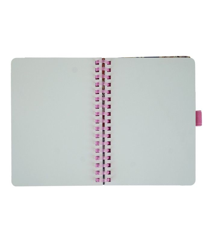 Cahier à spirale en plastique au format A6. 80 feuilles de papier ligné pointillé 90gr. Fermeture avec caoutchouc. Poche intérieure et porte-stylo.