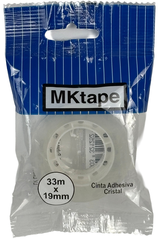 Cinta adhesiva de tamaño estándar 33m x 19 mm cristal. Se presenta en bolsas individuales.