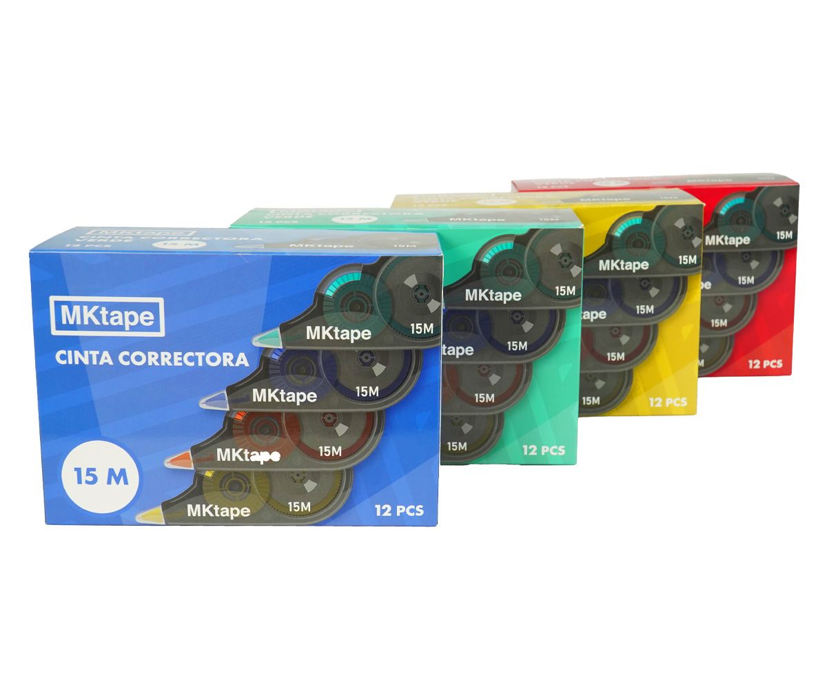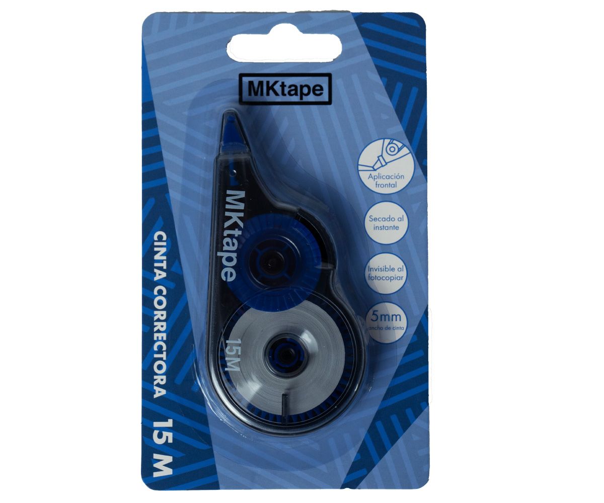 Cinta correctora de aplicación frontal. Invisible al fotocopiar y de secado rápido. Ancho de cinta 5 mm x 15 metros. Disponible en 4 colores de carcasa