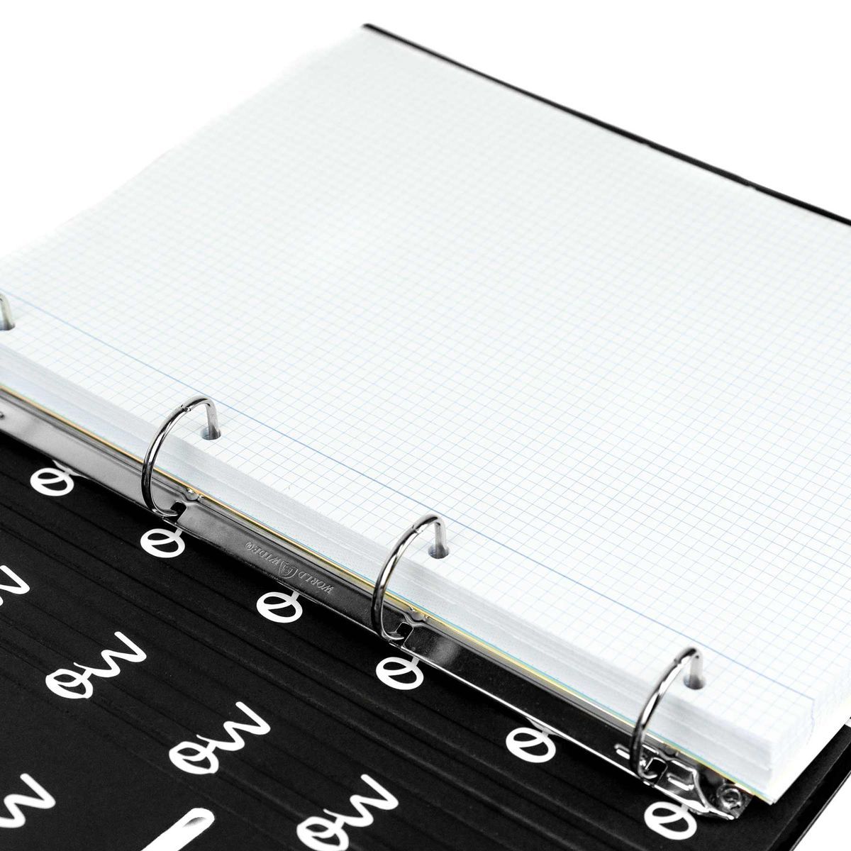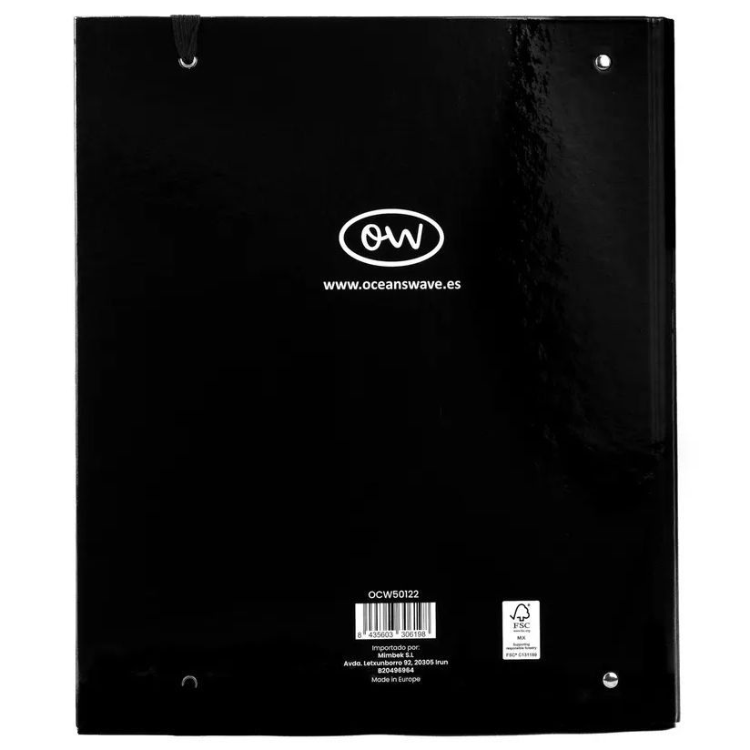 Carpeblock Ocean's Wave en noir. Fabriqué en carton très résistant. Composé d'une chemise 4 anneaux 40 mm plus une recharge de 100 + 20 feuilles gratuites de papier quadrillé 90 grammes 4x4 avec marge. Le dossier a une fermeture élastique et comprend également un séparateur en carton en 6 couleurs. Respectueux de l'environnement grâce à son certificat biologique FSC