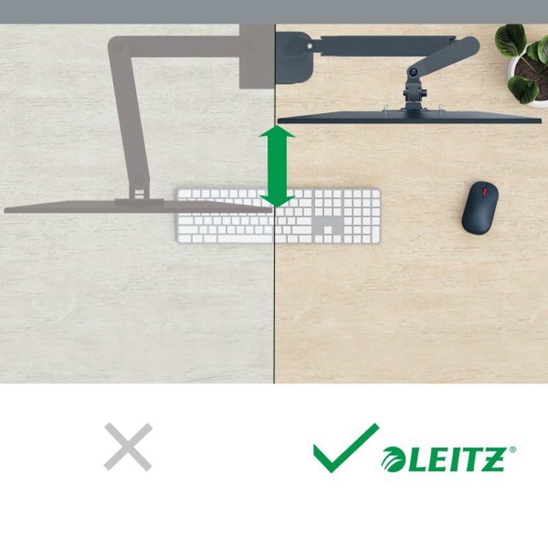 Le bras double pour écran et ordinateur portable Leitz Space Saving avec IGR (bras pour écran uniquement) et certification TÜV a un impact positif sur la posture, favorise un bon alignement des yeux et contribue au confort du cou et des épaules lorsque la hauteur du moniteur et de l'ordinateur portable est correctement réglée, et selon les recommandations, à la position ergonomique idéale. Le support pour moniteur et ordinateur portable reste stable à toutes les hauteurs et sous tous les angles, et peut être facilement basculé entre le format paysage et portrait. Son design est idéal pour les endroits avec peu d'espace et libérera un espace de bureau précieux grâce à ses bras ultra polyvalents qui peuvent être pliés, inclinés et manœuvrés dans toutes les directions sans effort d'une seule main. Conçu de manière ergonomique pour favoriser le bien-être et augmenter la productivité.