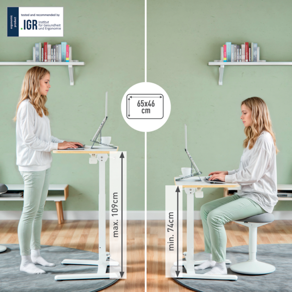 Plus d'informationsImagina una mesa ergonómica para portátiles, diseñada para sentarte o estar de pie, que se adapta perfectamente a tu vida, incluso en los espacios más pequeños. Esta mesa para ordenador portátil se pliega fácilmente hasta ocupar solo 16 cm de ancho, por lo que resulta ideal para guardarla junto al armario, debajo de la cama, el sofá o en salas de reuniones cuando no se utiliza. Sólo pesa 11 kg, por lo que es fácil de transportar. Con una configuración sencilla y un tamaño compacto, puedes colocarla en cualquier lugar con facilidad. Su moderno diseño aumenta el confort y la productividad, creando un espacio de trabajo que favorece su bienestar. El diseño compacto con una base de 65 x 46 cm es lo suficientemente espacioso para un portátil con soporte, teclado, ratón e incluso tu taza de café favorita. El escritorio certificado por el IGR (Instituto Alemán de Salud y Ergonomía), GS y TÜV (seguridad probada) cuenta con un suave ajuste neumático de altura (74-109 cm) que le permite encontrar la posición ergonómica perfecta sentado o de pie. El escritorio de pie portátil es ideal para un uso flexible y como escritorio temporal donde el espacio es limitado en su sala de estar, comedor, dormitorio, espacios de oficina y salas de reuniones. Este flexible e ingenioso escritorio plegable de pie/sentado es ideal para mejorar la comodidad y maximizar la productividad incluso en los espacios más reducidos. Nuestra misión es ofrecer soluciones que permitan a las personas prosperar en el trabajo y fuera de él, fomentando una salud mental y un bienestar físico positivos. Combínalo con otros productos Leitz Ergo para personalizar tu estación de trabajo flexible e individual, Sit, Stand & Move. Mantente activo, siéntete inspirado y disfruta de la comodidad en el trabajo y fuera de él: donde el diseño centrado en el ser humano se une a la máxima calidad. FEEL GOOD con Leitz.
