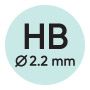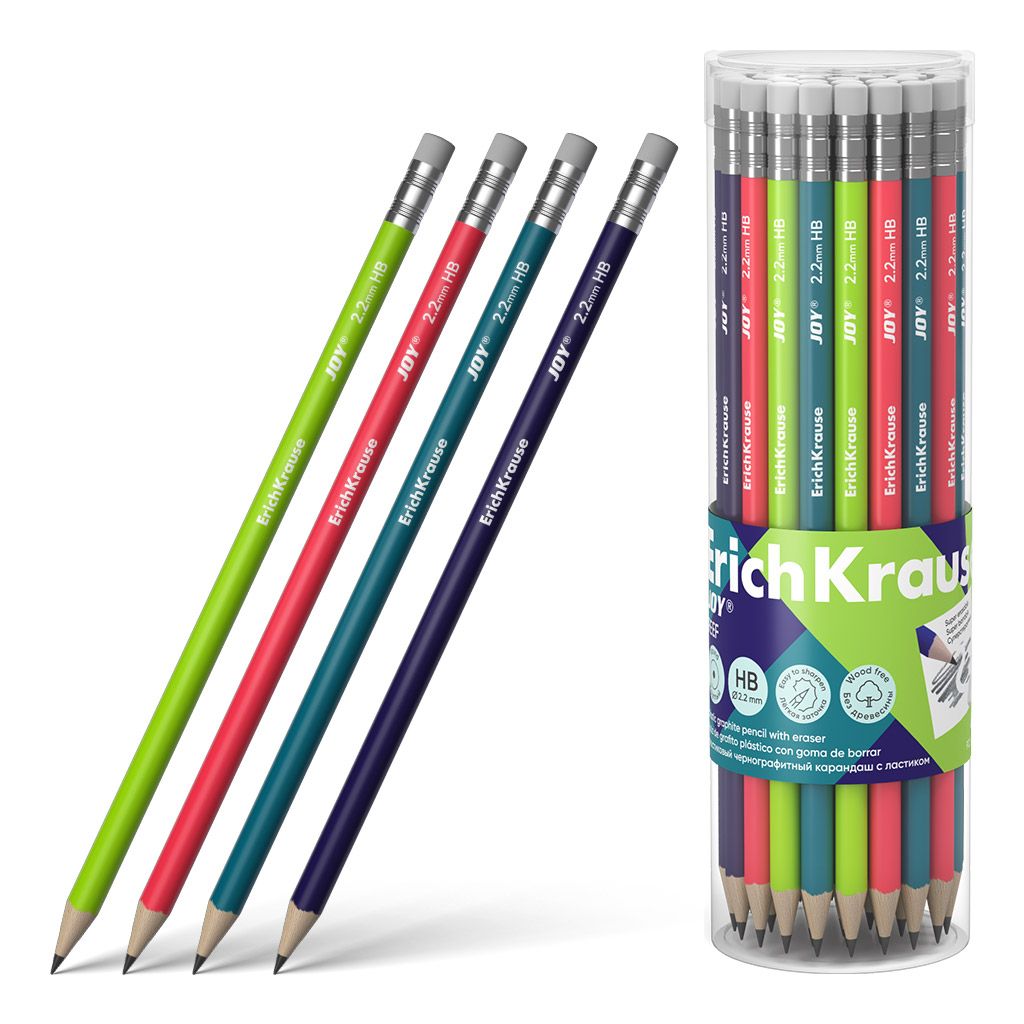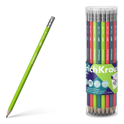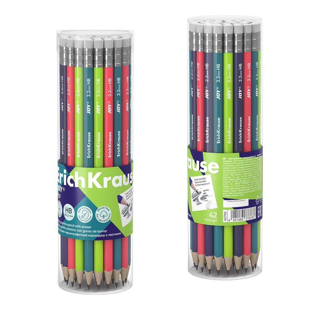 Lapiz de grafito con cuerpo de plástico redondo y goma. Mina de 2,2mm HB resistente a golpes. Fácil borrado. Bote 42 lápices.