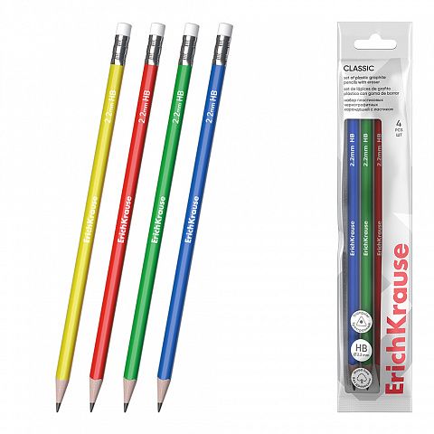 Set de 4 lápices de grafito HB de plástico ErichKrause Classic triangular y con goma de borrar.