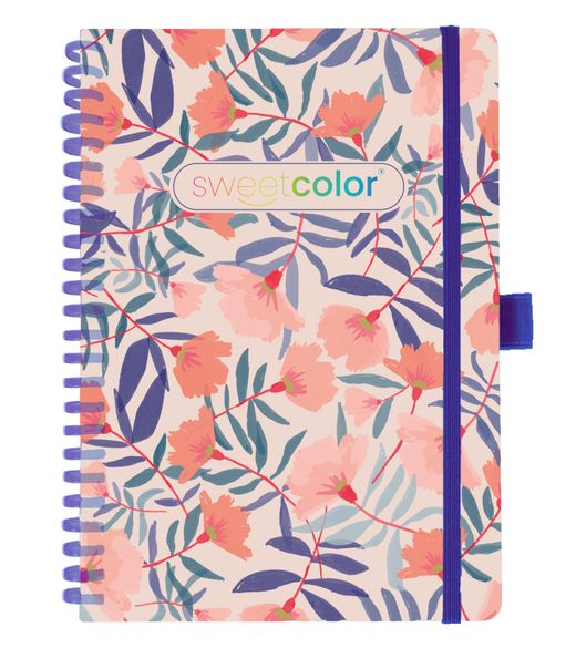 Libreta de espiral de plástico flexible. Tamaño A6, 80 hojas de 90gr lisas. Inlcuye portabolis y bosillo en en el interior. Cierre con goma.