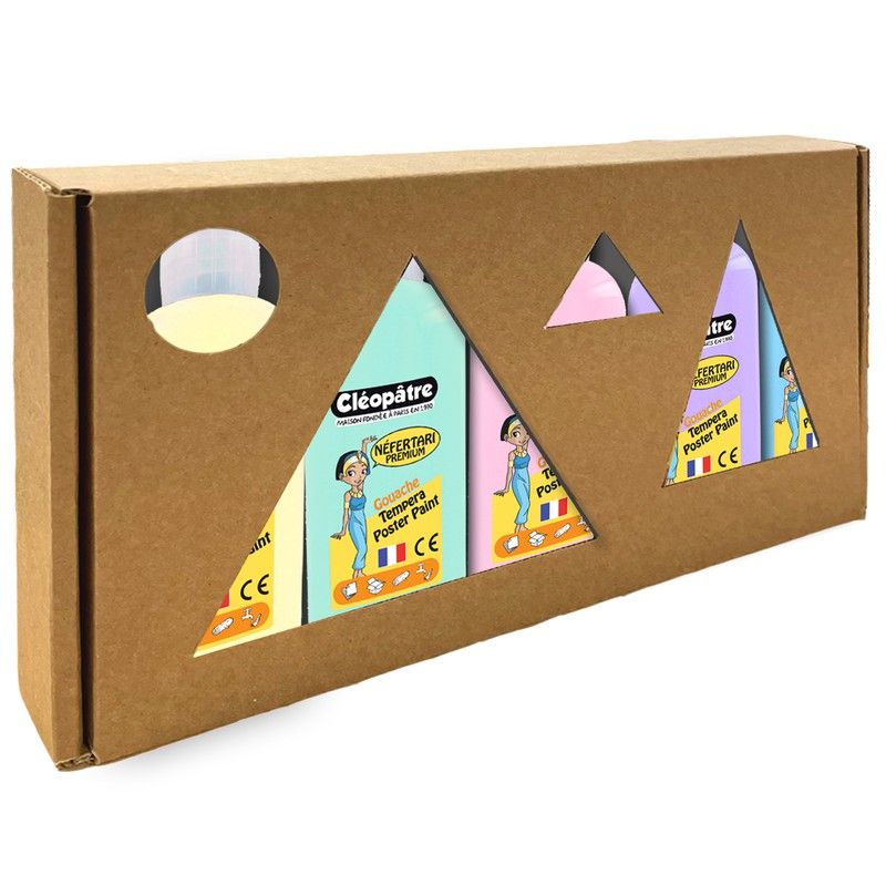 Tempéra à l'eau, crémeuse et très couvrante aux couleurs lumineuses et résistantes car concentrée en pigments. Il s'utilise sur tous supports, papier, carton, bois, terre cuite, plâtre et pâte à modeler. Ne craque pas une fois séché. Lot de 5 flacons de 100 ml aux couleurs pastel : jaune, rose, bleu, vert et lilas.