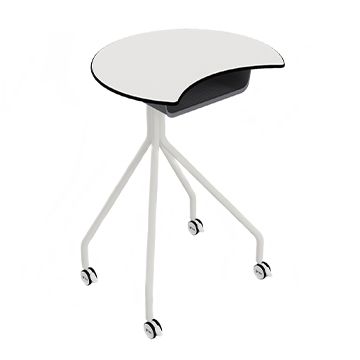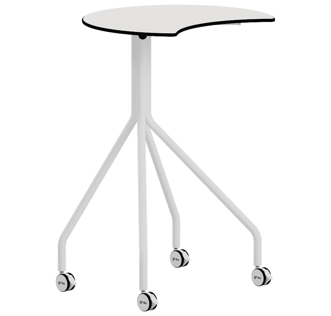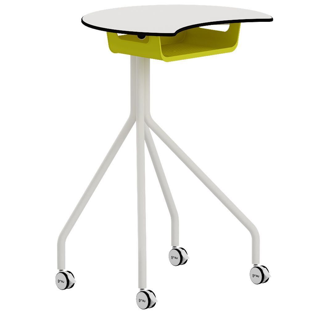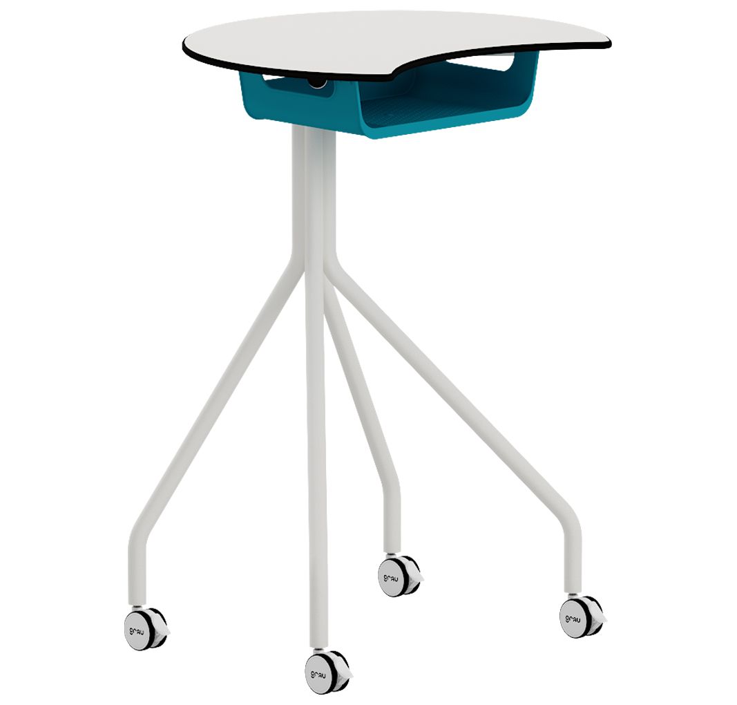 Mesa ATRIL de Grau. Puede ser un pupitre alto con diseño Eclipse o un atril, perfecto para profesor. Se le puede colocar como accesorio una bandeja BOX. Tiene una altura de 100 cm y cuatro ruedas con frenos. Fabricada en CDF blanco y siguiendo el estilo c