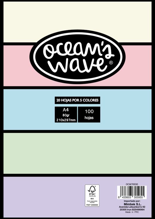 Paquet de 100 feuilles 80gr. Ocean's Wave avec 5 couleurs pastel. Taille DIN A-4