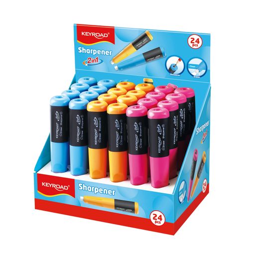 Portagomas triangular ergonómico con sacapuntas de 1 uso. Cuchilla de alta calidad. Expositor de 24 unidades.