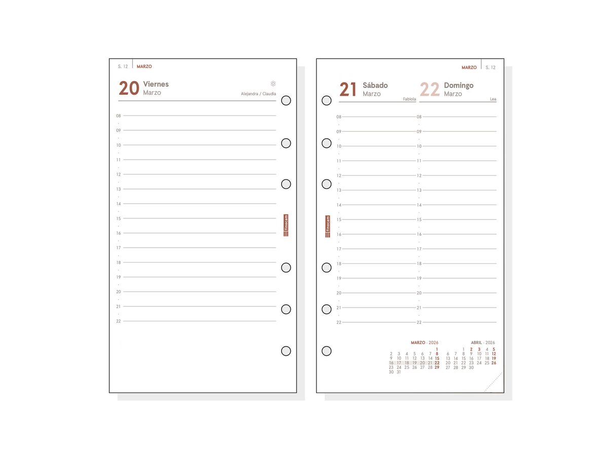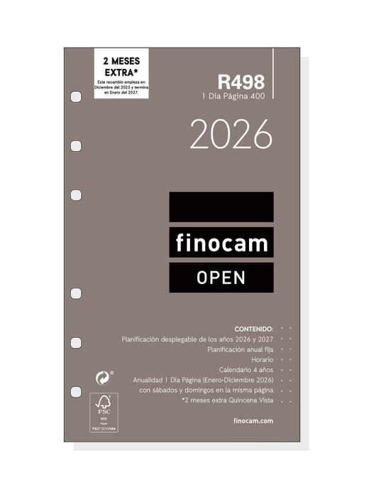 Recambio anual para agendas de anillas Finocam Open. La anualidad contiene la información útil relativa a: onomástica (excepto ed. portuguesa), festivos nacionales, cambios de estación e inicios de los años nuevos chino, musulmán, ortodoxo y hebreo. El recambio incluye plan anual despleglable y meses complementarios extra. Duración: Enero 2026 - Diciembre 2026 (12 meses). Interior: 1 Día Página. Amplio espacio de escritura para cada día. Con horas desde las 8:00h hasta las 22:00h. Con información de los festivos de España. Plan anual desplegable, planificación anual fija, horario, calendarios, anualidad y 2 meses complementarios Quincena Vista. Idioma del artículo: español. Formato: 400 - 91x152 mm. Papel. 70 g/m². Papel FSC®.