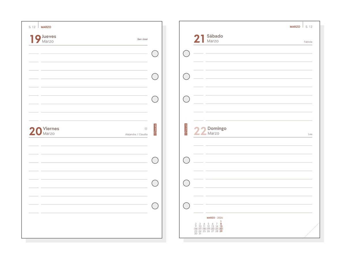 Recambio anual para agendas de anillas Finocam Open. La anualidad contiene la información útil relativa a: onomástica (excepto ed. portuguesa), festivos nacionales, cambios de estación e inicios de los años nuevos chino, musulmán, ortodoxo y hebreo. El recambio incluye plan anual despleglable y meses complementarios extra. Duración: Enero 2026 - Diciembre 2026 (12 meses). Interior: 2 Días Página. Amplitud de escritura para cada día. Con espacio para concretar horario. Con información de los festivos de España. Plan anual desplegable, planificación anual fija, horario, calendarios, anualidad y 2 meses complementarios Quincena Vista. Idioma del artículo: español. Formato: 500 - 117x181 mm. Papel. 80 g/m². Papel FSC®.