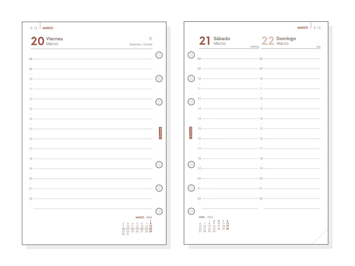Recambio anual para agendas de anillas Finocam Open. La anualidad contiene la información útil relativa a: onomástica (excepto ed. portuguesa), festivos nacionales, cambios de estación e inicios de los años nuevos chino, musulmán, ortodoxo y hebreo. El recambio incluye plan anual despleglable y meses complementarios extra. Duración: Enero 2026 - Diciembre 2026 (12 meses). Interior: 1 Día Página. Amplio espacio de escritura para cada día. Con horas desde las 8:00h hasta las 22:00h. Con información de los festivos de España. Plan anual desplegable, planificación anual fija, horario, calendarios, anualidad y 2 meses complementarios Quincena Vista. Idioma del artículo: español. Formato: 500 - 117x181 mm. Papel. 70 g/m². Papel FSC®.