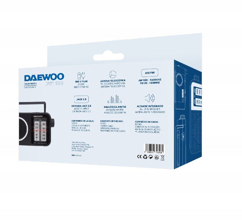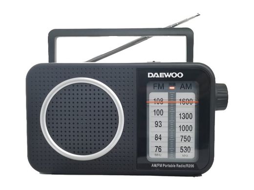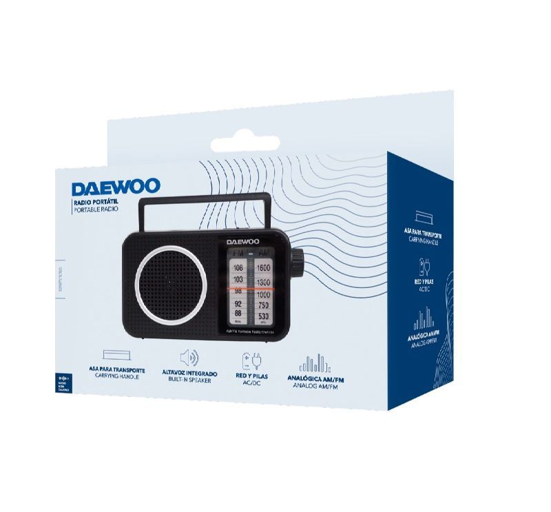 Radio analógico AM/FM con altavoz integrado. Con asa para fácil agarre para transporte. Antena telescópica. Alimentación via red y pilas. Entrada Jack 3.5