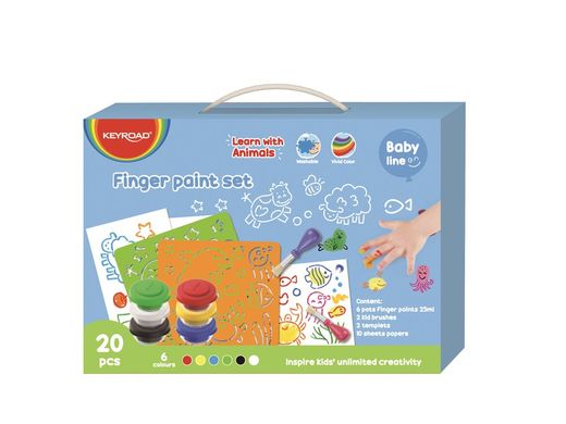 Ensemble de peinture au doigt pour apprendre les animaux. Composition non toxique et facile à nettoyer. 6 couleurs : Rouge, jaune, bleu, vert, blanc et noir. Comprend : 2 pinceaux faciles à saisir, 2 pochoirs avec divers motifs d'animaux et 10 feuilles au format A4.
