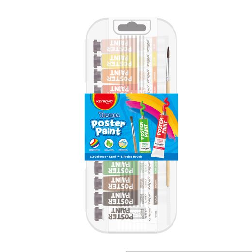 Témpera en tubo de 12 ml en caja de plástico. Colores de alta pigmentación y cobertura. No tóxico. Super lavable. Incluye pincel. 12 colores básicos.